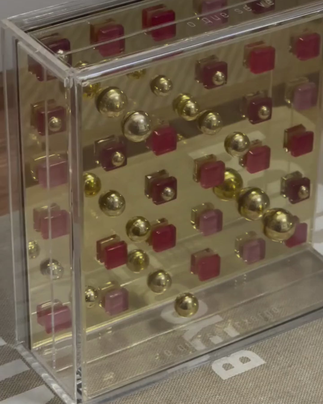 material: acrílico transparente, acrílico espelhado dourado e plástico